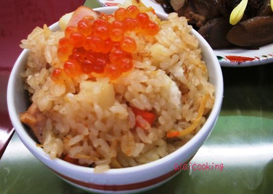 料理教室北海道イベントでは、炊き込みごはんも作りました。海の幸とホクホクじゃがいもの、「北の幸ごはん」。美味しくないわけがない素材でいっぱいの贅沢ごはん★材料 【ごはん】・・・水に1時間ほど、つけておく。 米 ・・・1.5カップ もち米・・0.5カップ 水 ・・・350ml 【具材】 鮭 ・・・200gほど(皮と骨をとって、1口サイズにカット) 生姜の絞り汁・小さじ1(鮭をつけるため) 帆立・・・4コ(1コを4切れくらいにカット) じゃがいも・・・140g(1センチ角切) にんじん ・・・ 70g (5ミリほどに角切) 【調味液】 千切りの生姜・・・30g(皮ごと) 醤油・・・大さじ3 酒 ・・・大さじ3 水 ・・・100ml★作り方 (1)鮭を生姜汁につける。 (2)鍋に調味液を煮立てて、鮭と帆立を加えて軽く煮る。 (3)この煮汁120mlを、米&もち米に加えて、じゃがいも・人参を加え炊く。 (4)炊き上がったら、鮭と帆立をのせ、蒸らして、できあがり。 ※イクラをトッピングしてもよい。生姜がいい香りでクサミもなかったし、じゃがいもはホクホク、北海道の香り高い美味しいごはんになりました。