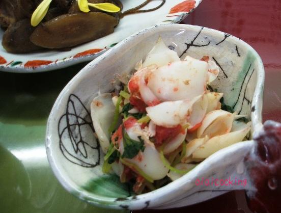 月に1度、料理教室では特別イベントを企画。生徒以外誰でも参加できる講座です。今月のテーマは、「北海道」。北海道の野菜業者が新しくスポンサーになった記念イベントでした。そのうちの1品は、「百合根の梅和え」百合根は、総出荷量の95%以上が北海道産。2回ツボミを刈り取るらしいので、3年かかって出荷。知らなかったなぁ。★材料 百合根:2コ 三つ葉:1束 梅 干:大1こ 【調味液】 酒・・・小さじ2 醤油・・小さじ1 おかか・・小パック1袋★作り方 (1)百合根は、1枚づつ剥がしてよく洗う。汚れを削る。 水から茹でる。(2-3分) (2)三つ葉は、ザク切にして熱湯で茹でる。 (3)タタいた梅干と調味液を、百合根と三つ葉に和えて、できあがり。 百合根は、ホクホク、もっちり。 蒸し物や唐揚げもいいけど、梅との相性も見た目もキレイでよかったです。