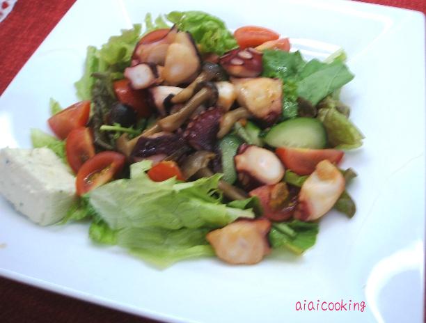 お料理教室の仕事で、裏でこっそりの楽しみは、お酒の味見。ワイン講座のときは、「お勉強」と称して、勤務中だけど皆でコクリ。手軽なワインに合わせて1品作るという人気の講座で、「タコとキノコのホットサラダ」を作りました。★材料 ◎タコ(茹でたもの)・・・300g :ぶつぎりにしておく ◎キノコ:エリンギやブナシメジなど1パック :ほぐしておく ◎野菜:プチトマトやサニーレタス、ルッコラ などあるもの。 ※味付け ニンニク(みじんきり)1カケ しょうゆ:大さじ2ー3 オリーブオイル ※ドレッシング 白ワインビネガー 大さじ1 EXオリーブオイル 大さじ3 塩・こしょう★作り方 (1)フライパンにニンニクとオリーブオイルを熱し、香りが出たらキノコを加える。 (2)キノコがしんなりしたら、タコを加え、さっと火が通ったら醤油を加える。 (3)醤油がなじんだら、火をとめる。 (4)皿に生野菜とタコ&キノコを盛り付け、ドレッシングをかけて仕上げ。この日は、イタリアの白ワイン(エストエストエスト)合わせました。ほんと、カンタン。酒の肴は、お手軽なのが1番。('▽'*)