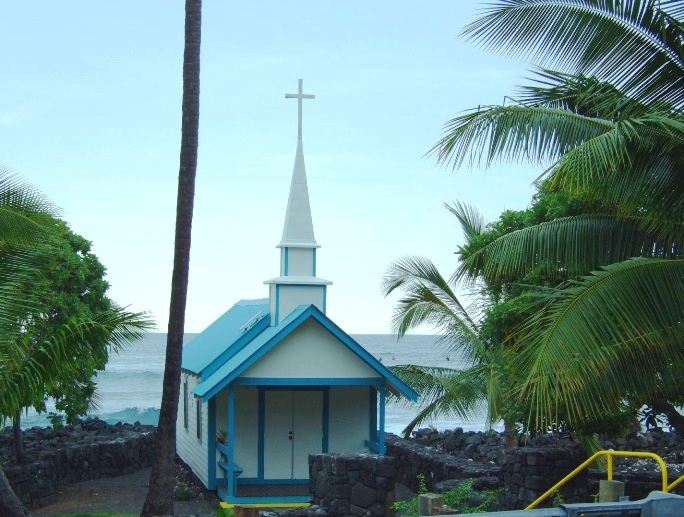ハワイ島 コナにある「セントピーターズ教会」は、聖地エリアに建てられているからなのか、面白い話がいっぱい。ガイドさん曰く、ここもパワースポットよ。だって。なんでも昔、ハワイ島で起きた大きな水害の際にセントピーターズ教会は、沖まで流されてしまった。でも、数日後、スイスイとまた流れてきて狂うことなく元の位置に建っていたそう。ハワイって、こんな話が多いよね。★1889年に建設された世界で2番目に小さい教会。 「リトルブルーチャーチ」の愛称。 ガダルカナルタカさんも挙式をしたらしいけど、 水色がキレイなオモチャのような教会でした。