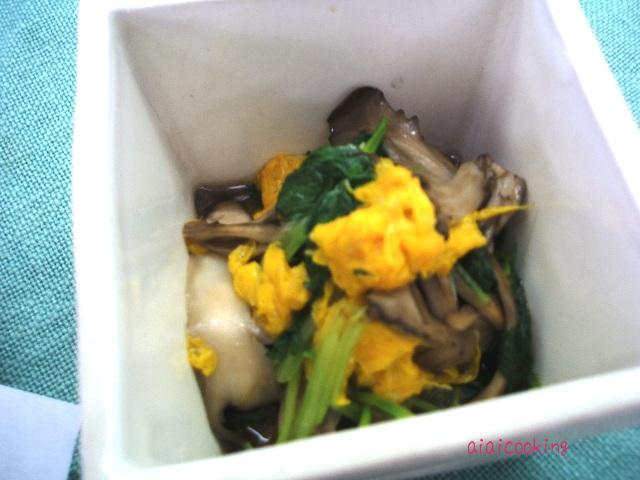 食用菊はキレイだし、汁物やおひたし、トッピングと料理教室でも頻繁に登場。海苔みたいに板になった乾燥菊も売っていて、保存もきくので便利。熱湯に少し酢をいれて茹で、水にさらして使います。今日は、生の菊で「菊と舞茸のおひたし」を作りました★材料 ◎菊 60g (ほぐす) ◎舞茸 2パック ◎三つ葉 1袋 【調味液】 だし汁・・・100ml 薄口醤油・・大さじ2 砂糖 ・・小さじ1★作り方 (1)菊は、熱湯に酢をいれて、さっと茹で、冷水にさらす。 (2)舞茸は薄切りにして、ゴマ油で炒める。 (3)三つ葉は、さっと湯通しして冷水にとり、カットする。 (4)調味液と菊、舞茸、三つ葉を和えて、できあがり。 ほうれん草と和えても色がキレイ。 食感もよいし簡単でオシャレな1品。