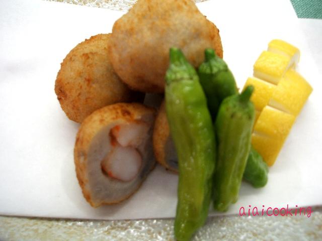 蓮根は大好きだし、煮ても焼いてもおいしい。プライベートで勉強中のマクロビオティックでもよくお料理に使います。料理教室では、お団子にして揚げました。今回は、「蓮根とエビでモチモチ団子」を作りました。★材料 ◎れんこん・・・400g :すりおろす。 ◎エビ ・・・16尾 :殻・背ワタを取り片栗粉で洗って、調味液でさっと煮る。 【調味液】 塩 ・・小さじ1/2 酒 ・・150ml 味醂・・おおさじ3 ◎上新粉 :大さじ4 ◎塩 :小さじ1/4 ◎ドライパン粉:30g~ :まとまるように混ぜる。 ◎ししとう・レモンなどのつけあわせ ★作り方 (1)すりおろした蓮根をボウルにいれて、上新粉、パン粉、塩を加えて16等分。 (2)エビを入れて包む。 (3)油で揚げる。ししとうなどの付け合せも素揚げ。 (4)レモン、塩を添えて、できあがり。 上新粉がモチモチ感、パン粉が蓮根の水分を吸ってとじこめ、 ジューシーにしあがりました。