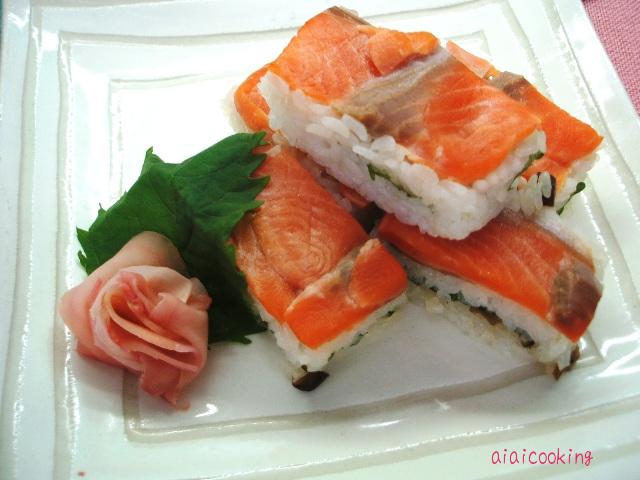 料理教室所属の先生は、何十人。先生によって、お料理の見た目も味も随分違いますこの先生の講座はオシャレで、助手するのが楽しみ。先生に似て華やかな料理、ピンクと白の色合いキレイな、「サーモンの押し寿司」を作りました。★材料 ◎サーモン(刺身用)・・・300g :塩を振って、「酢洗い」をして塩をとっておく。 【調味液A】 酢 ・・50ml 薄口醤油 ・・大さじ1 ◎干し椎茸・・・大2枚: みじんきり。調味液Bで汁気がなくなるまで煮る。 【調味液B】 だし汁・・・150ml 砂糖 ・・・大さじ1 醤油 ・・・大さじ1 味醂 ・・・大さじ1/2 ◎米 ・・・2カップ :水500mlと昆布茶小さじ1で炊く。 【合わせ酢】 酢・・・大さじ4 砂糖・・大さじ2 塩 ・・小さじ1 ◎青じそ・ガリなど ★作り方 (1)酢洗いをしたサーモンは、Aの調味液に10分漬けて、薄切りにする。 (2)炊き上がったごはんに、合わせ酢をうって、冷まし4等分に。 (3)流し缶にラップをして、酢めしをおき、椎茸・青しそをひいたら、 再び酢めしを置く。 (4)一番上に、サーモンを並べて、上から押さえる。 (5)切り分けて、ガリなどと盛り付ければ、出来上がり。 酢めしが食欲をそそります。 おもてなしにもピッタリな1品になりました。