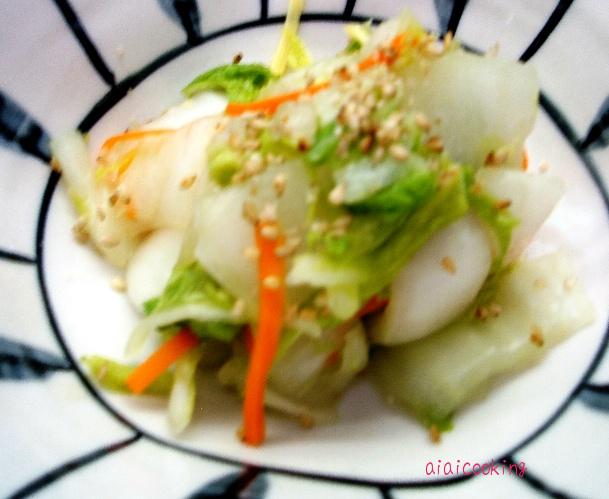 ちょっとづつお野菜が余ったときには、即席漬けものが便利。料理教室では、ビニール袋をつかうカンタンな方法で、「白菜の即席漬け」をつくりました。★材料 ◎白菜:300g ・・ザク切 ◎人参: 30g ・・千切り ◎生姜:1片 ・・千切り 【調味液】 昆布茶:大さじ1~2 酢 :大さじ1 いりゴマ:小さじ1★作り方 (1)ビニール袋に野菜と、昆布茶をいれて、モミモミ。 (2)シナってなったら、酢を加え、しっかりと空気を抜いて置く。 (3)20分後~食べごろ。 (4)イリゴマをひねってふって、できあがり。 あまり材料がないときは、この一品とビールで。 数日間は、保存きくので、簡単だし、ベンリ。