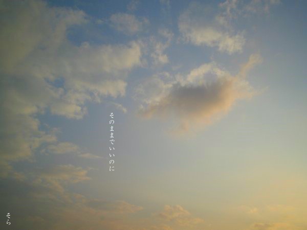 「きれいだね」あなたの声がうしろから聞こえたうしろを振り返ると優しく笑うあなたがいた「うん きれい」なんでもない会話がとってもあたたかくてとってもやさしくてあなたの笑顔がとってもあたたかくてとってもやさしくてあなたと見た夕焼け空はわたしの心にぬくもりをくれましたそこにいてくれて ありがとうphoto by sora