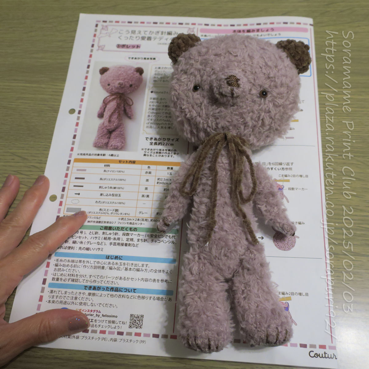 フェリシモのクチュリエこう見えてかぎ針編みくったり愛着テディベアの会4つ目の ポレットが出来上がりました~ポレットは、お菓子作りが大好き…という設定。水色のシャルルは ダンスが大好き。ピンク色のマリーは 読書好き…とかね。片腕にぎゅ~ってしてみたり。大きい頭のポレット、なかなか可愛く出来て嬉しい。