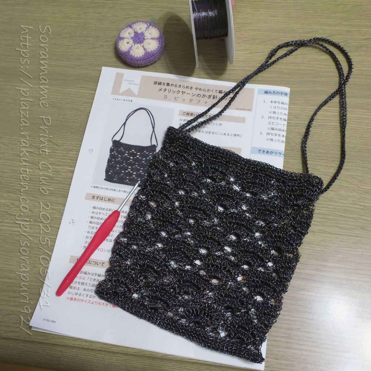 フェリシモのクチュリエメタリックヤーンのかぎ針バッグの2回目は、黒のメタリックヤーンで編むバッグシェル編みとか、松編みとか言うのかなぁ底を編んでから、側面を模様編みでぐるぐる編んでいくので とじはぎなし。模様編みも段ごとパターンの繰り返し。割とすぐに編めちゃいました。初めての挑戦は、エビコードの紐。これも慣れれば難しくないけど、糸が細くて色は黒。老眼にはちょいきつかった…エビコードは、伸びにくいので、スマホショルダーバッグにも活用できそう。おまけ今朝もポリッキュ1本♪