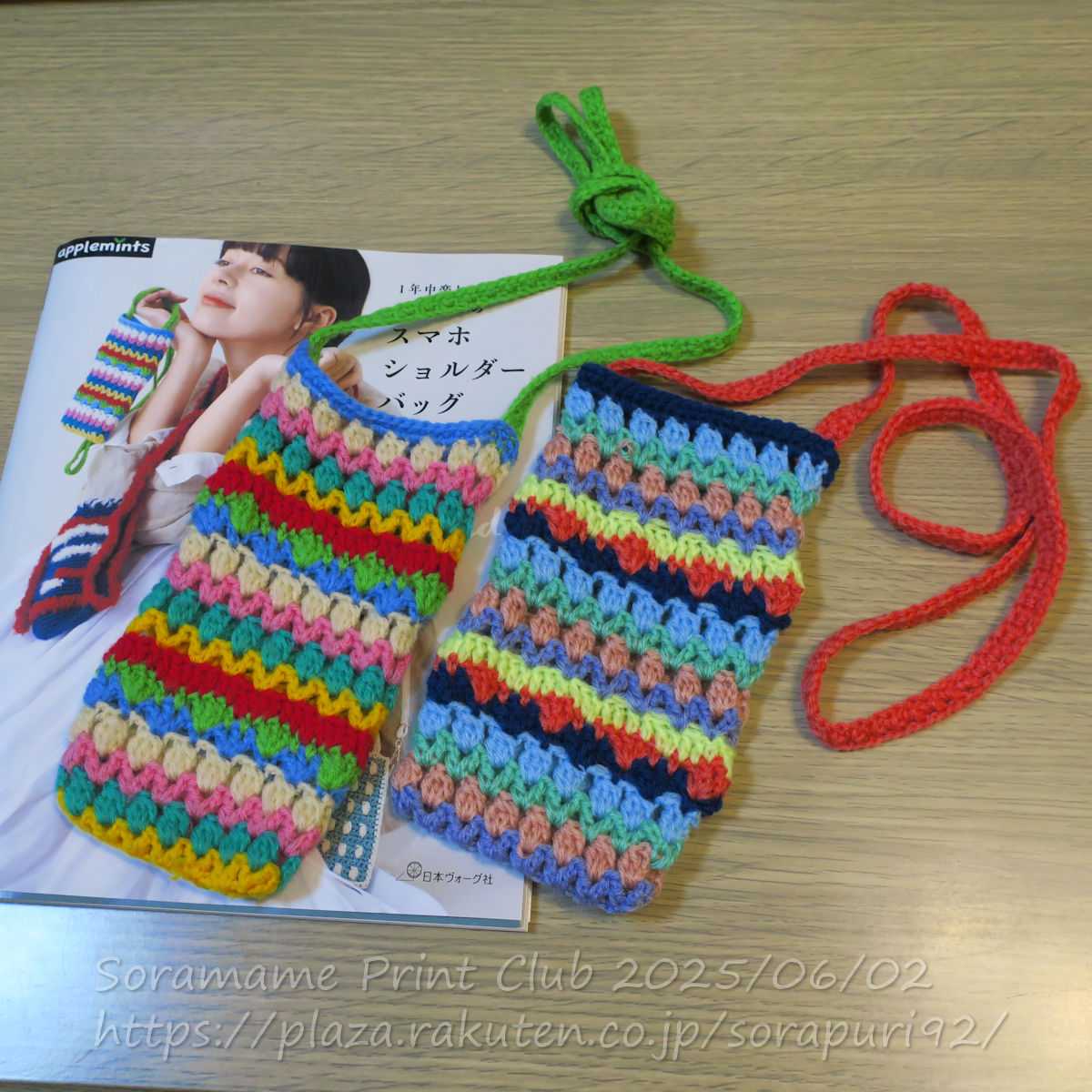 ハマナカのピッコロ7色で編むスマホショルダー。軽くて使い勝手がいいので、色違いでもう一つ編みました。(紐が赤系のほう)少し落ち着いた色の配色。でも、紐はサーモンピンク。さっそく明日から使ってみよっと。