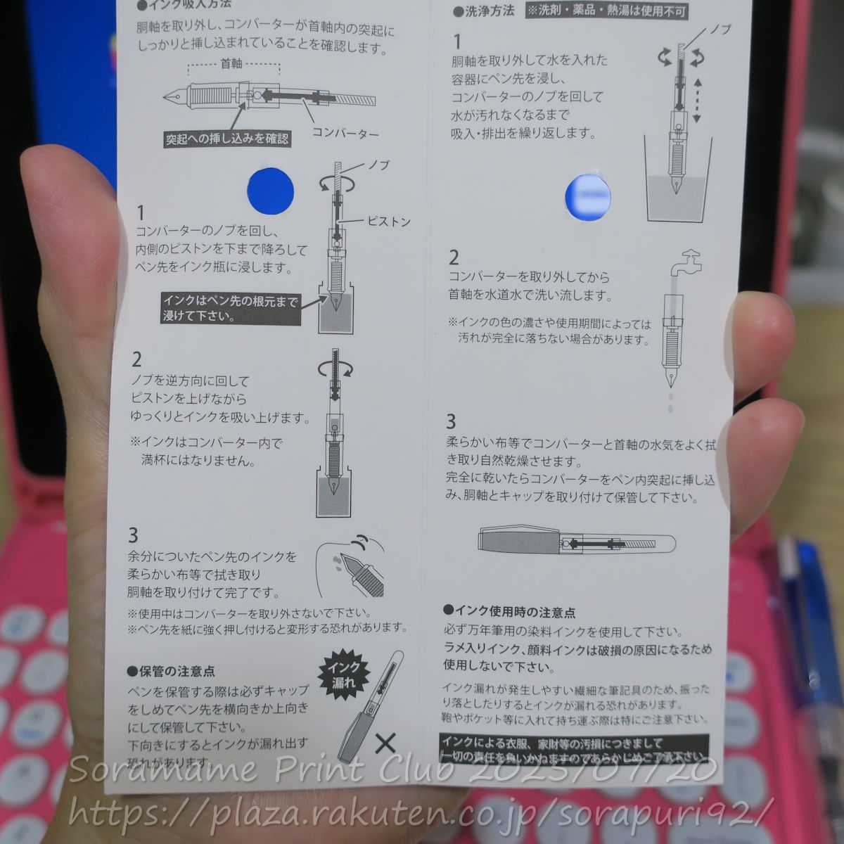台紙の内側に、コンバーターの使い方や手入れ法が