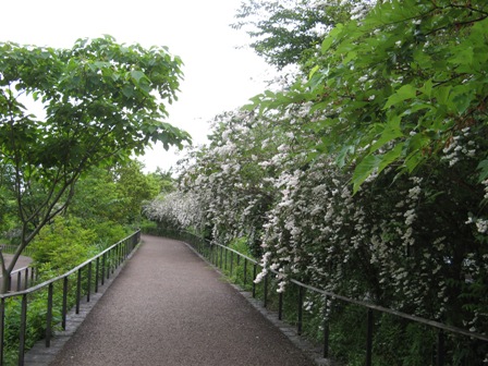 午後になって咳もおさまり、お部屋暮らしにも飽きてきて洗濯機を回しながら歩いて5分の赤羽自然観察公園に出かけてきた。北側の入り口の階段の真ん中あたりから更紗空木の花盛り。あちらこちらに緑の中に白く輝いている。こんなに沢山の更紗空木をみたのは初めて。ジュラさんに教えていただくまでは、卯の花と思っていました。卯の花はただの空木のこと。ただの空木は八重ではありません。一番初めに空木をアップします。更紗空木と空木が混在しているようです。 更紗空木ではない「空木」(別名 卯の花?)よく見ると一重の可愛い花です。咲いてからしばらく経っているようでおしべとめしべが茶色。更紗空木:よく見るとピンク掛かっている。お花は皆下を向いているので、お花の全貌はなかなかつかまらない。ちょっと下からのぞくとこんな感じ。遠くから見ると白くボーっとしているが、近くで見ると豪華で鮮やか。ぴんくがかっているのが少し可愛い。更紗空木の下を見ると、ナニワイバラににた白い花。ノイバラににているが、地面を張っている。ツル茨?名前は正確にわからないけれど端正なお花。葉っぱがテカテカしていたらテリハノイバラ。テカテカしている?路を進んでも卯の花が続く。池の近くの木の端には桐の実が落ちている。上を見上げると桐の木が。橋をわたり緩やかな斜面を上っていくと山アジサイ。お花が長辺形というのがなんとなく律儀でゆかしい。園芸種に比べて小ぶりで清楚。来週になればもっと咲いているのだろうか。うわさに聞いていたマユミの花にも合えた。蟻が居座っている花ばかり。これがあのピンクの実に成るとはちょっと想像し難い。秋の実になるまでどんな変化をしていくか見て行きたい。イボタノキの花。とっても小さいが、マクロで何とか撮れた。少し甘い香りがした。初夏の花は白いものが多い。唯一ムラサキシキブが薄いピンクの花を咲かせていた。ここのイロハ紅葉は素晴らしい紅葉だという。真っ赤に燃えているような色とか。写真を撮っていたら近所に住んでいるという伯父様が話しかけてきた。一時間弱の散歩だったけど、初夏の花に出会えたのが嬉しい。開園時間が8時から5時というのが働いているものにとっては利用しにくい。せめて開園を7時にしてくれたら朝の散歩を楽しめるのに。