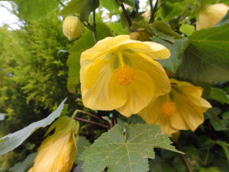 91歳のNさんは昔肺結核のために肺切除している。そのために慢性呼吸不全になりここ半年は誤嚥性の重症肺炎を繰り返して病院生活が長期化している。このまま病院で暮らすのは忍びないと、一日でも二日でも自宅療養をさせたいと、酸素療法と中心静脈栄養を受けつつ自宅に戻る準備が始まった。奥様も88歳で要介護認定を受けているようで、腰が曲がり立っているのもつらそうなのに夜間は奥様一人で介護する予定という。息子さんは昨年亡くなられたそうだが、その息子さんのヘルパーさんの会社の全面的支援を受けて状態が落ち着いたところで1週間をめどに自宅生活をすることになった。重症肺炎を繰り返し、酸素の量も時に高濃度(7l/m、10l/m)を使うこともあるようだ。誤嚥性肺炎を繰り返すことで経口摂取は禁止となり、栄養は中心静脈栄養からの輸液管理となっている。80代の妻が90代の妻が介護する。それも医療処置が多く、果たして何日間自宅で生活できるのか目途が立たない。予後は不良だが、体調の良い時に数日だけでも良いので自宅での生活をもう一度鯵合わせてあげたいというご家族の気持ちのようだ。「息絶えた時には、その時はいたしかたない」と妻も覚悟しているようだ。6月初旬に一週間の退院を計画していくことになった。担当しているヘルパーさんとは10年来のお知り合いのようで、今度の退院もご家族の気持ちを踏まえ、訪問介護事業所が全面的支援をすることで、退院を決められたそう。訪問介護で24時間対応する予定のようだ。訪問看護も24時間体制で毎日訪問する予定。6/6退院するの状態さえ良ければ13日に再入院の予定。それでも数日間でもよいので自宅療養をしたいとご本人もご家族も考えておられる。合同カンファレンスの後、患者さんに会いに行くと、昨日から高濃度の酸素を受けており酸素飽和度も低い。今日の状態を見た限り、在宅生活はかなり難しそう。退院日から毎日訪問看護に入るのだが、どこまでできるかは心もとない。とりあえず、あと2週間状態が安定したところで在宅生活に戻り全力で対応していくしかないのかな。今朝、やわらかな黄色の下向きの優しげな花に出会った。下を向いていると何か恥ずかしげに見えてしまう。アブチロン。アオイ科アブチロン属。家畜の下痢止めに効果があるそうだ。花言葉は「憶測」とか。 重症肺炎を繰り返している方がたった数日でもご自宅に戻られるということなので、最大限にサポートしていきたい。