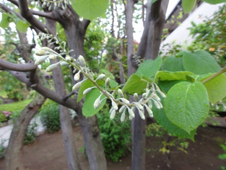 長徳寺に咲き始めた木のお花。こんな細長い花の蕾。昨日寄ったら、白い花が咲いていた。葉に形にはこんな様子。白い可憐な花。咲く前は卵形の蕾。ほのかに甘い香りがしてきます。 この花はどなた?