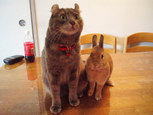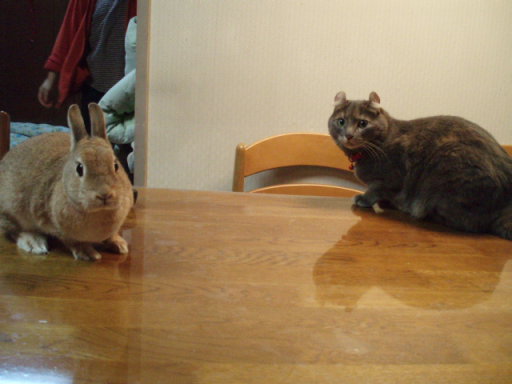 【ナチュ:実家。ウサギとの生活二日目。】今日もいるんかい・・・ ≪小雪さん:・・・・。≫目合わせんの怖いし・・・あっち向いとこ。 ≪小雪さん:避けてんのね?どれどれ・・・≫≪小雪さん:ピトッ。≫ぎょえっ!!こっち来た?!何なのよ!!ドキドキッ!知らんぷり・・・知らんぷり・・・ナムナム・・・・・・・・・早くどっかいけよっ!もうっ!!足がすくんで・・・動けない・・・こいつ・・・ついてくる~~~~ひょえ~~≪小雪さん:ピトッ。≫なんじゃこいつ。クンクン・・・。【ナチュ:仲良くなったの?ハイ・チーズ♪】【ナチュ:ツーショットっ!視線がバラバラね・・・】 あ~ゲッゾリ・・・なに。何なのあのウサギ・・・。【ナチュ:いいじゃないの♪仲良くなさい~】 ・・・・・・・・・・・・・・・・・・・・・・・・・・・・・・・・・・・・・・・・・・・・・・・・・・・・・・猫とウサギ。でこぼこコンビに注目~ポチッと☆さらに、明日のウサギが気になるポチッと♪ ↑よろしくお願いします☆