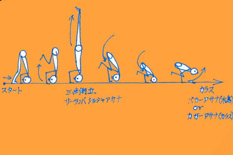 きのうから、三点倒立より、カラスのポーズに入るヨガの練習をしています。うまく出来ると気持良い♪です。三点倒立、頭と両手のひらでする逆立ちです。ヨガポーズでいうと、サーランバ・シルシャーサナ。これから、カラスのポーズ(カガーサナ)に入る上級者用の連携の動きが、アイアンガー先生の本、「ハタヨガの真髄」にでています。P332~ (pupujonjonさん見てるか~ konomiさんは孔雀マスターなので、こんなのは簡単でしょう (*^_^*)) カラスのポーズはアイアンガーヨガでは、 バカーアサナ(水鳥のポーズ)といいます。 普通はカラスで通っている、ヨガポーズなので ここでもカラスで名前を統一します。これをきのうから、やっています。1 頭と手のひらで、三角支持をし、両足を頭に向け出来るだけ近づけます。そうすると、上半身の軸(杖)に腰という重いブロックが乗っていき、足が自然に浮いてきます。2 バランスを取りながら、両足を天井に向かってあげ三点倒立(サーランバ・シルシャーサナ)のポーズに入ります。 このあと私は、両足を横に大きく広げたり、しぼめたりの 左右開脚や 前後開脚をします。プラスα三点倒立の姿勢から、息を吐きながら、膝を曲げていき3 左右の肘外側に、それぞれ左右の膝を乗せていきカラスのポーズに入る体勢になります。4 前方に重心を持っていき、背骨から両腕に軸を移します。5 腰と頭で、シーソーのようにバランスを調整、頭を上げ、腕を伸ばしていきます。カラスのポーズの完成です。ゆっくりゆっくり、呼吸とバランス、軸の移しを意識してやってみましょう。うまくできると、とても充実感がありますよ。バランスをとりながら空中でヨガポーズの連携をすると、体が引き締まります。