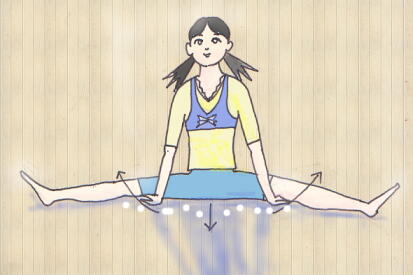 大きく脚を開いて行なうヨガポーズかっこいいですね。その開脚系のヨガの補助として私が見つけた、やり方をお教えします。これを見て、得したね~(笑) 1 長座から、左右に脚を開きます。 できるだけ開いたら、2 ふとももの真中の下に 後ろ向きにした手を差し込みます。 右太ももには、右手、 左太ももには、左手です。 そこに体重をかけ、掌をしっかり床につけます。3 腰を前に、すこしづつ出して行きましょう! 両手、前腕部がストッパーになって、 腰を前に出せば出すほど、脚が開いていきます。4 手も指先をじわじわ歩くように後ろに、もっと深く差しこんでいきます。5 ある程度開いたら、少しだけ緩め、腰、太ももをゆすり リラックス~♪6 そしてまた、腰を前に!、手のひらを後ろに!を、 繰り返します。* このやりかたを時間をかけ、じっくりやってみて下さい。 思ったより脚が開けるものです。あなたの素敵な脚が、もっと素敵に見えますよ。