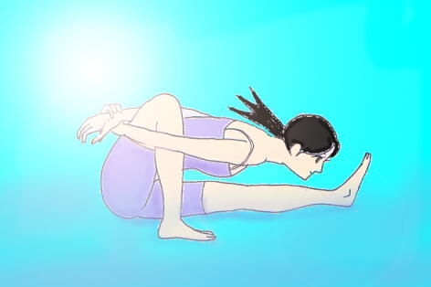 マリーチアサナでしっかり骨盤を地面に下ろしましょう。骨盤のグランディングです。腰を据える感覚が、生きているって実感です。このマリーチアサナAは、片足を伸ばし、もう片方の膝を立てかかとをお尻の方に引きつけ前屈するヨガポーズです。左右の脚を違う形にしたポーズで骨盤と、股関節の調整をしています。曲げた側のお尻が浮き上がり気味になると思います。それを沈めるため、正式なマリーチアサナAでは、後ろにまわした両手を腰のうしろでつなぎ(ハンドグリップ)立てた脚と骨盤を、締め付け抑えています。この後ろ手がきつい方がいらっしゃると思いますので簡易版のマリーチアサナで、腰と股関節の柔軟をしながら体をほぐしてみましょう。1 脚を伸ばした姿勢(長座:ダンダアサナ)で背筋を伸ばしアキレス腱を伸ばし準備をします。 お尻の左右をしっかり意識して床に降ろしておきます。2 右足を曲げ、膝を立て踵を右お尻の少し外へ引きつけます。3 伸ばした左足は、まっすぐの状態にし、内や外へ傾かないように気をつけます。4 息を吸って胸を開き5 右手を後にまわし膝にひっかけます。6 息を吐きながら少し体を前に倒し、右腕で右足を後に押します。 7 ゆっくり呼吸を続けながら、後ろに押している力を利用して 右お尻を床に沈めていきます。8 左右の骨盤のバランスをとりながら力を加減してみてください。 これを脚を換えて反対も行なってみてください。これをする前と後では、腰(骨盤)の感覚が違っているはずです。