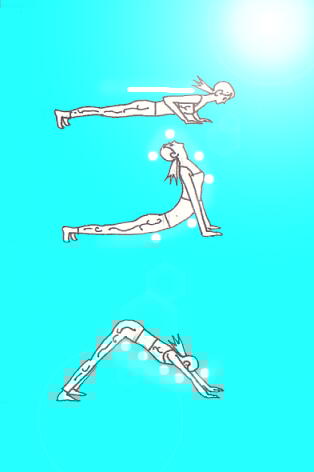 先日ブログを見ていただいている”かなさん”からチベット体操の五番目の紹介の呼吸が逆ではないかという指摘を受けました。たしかにその通りですので、ここに訂正させていただきます。チベット体操の第5儀式は、ヨガで言うドックポーズ(シュワーナアサナ)に相当しますが。ヨガ・アップドックでは息を吸い、体を反らすのですが、チベット体操の場合息を吐きながら反らします。これで背骨の負担を軽くしているようです。さらにダウンドックでも、息を吸いながらお尻をあげていきます。ヨガと逆の呼吸です。踵を踏みしめる時に呼気を強く吐きます。チベット体操として行なう場合、この呼吸に従ってください。 ●このチベット体操とおなじ呼吸でドックポーズを繰り返す ヨガもあります。 沖ヨガの浄化法に出てくる”山と谷のポーズ” おなじく、沖ヨガの強化法にある”尺取虫”の前進の動きです。 この場合通常のヨガのドックポーズとは逆呼吸で動作します。 頭こんがらがりますね(*^_^*)かなさん♪ありがとうございました。細かいところまで、ちゃんと読んでいていただいて。そして間違い、すみませんでした m(__)mチベット体操第5儀式は、ヨガをされてる方にはご存知、ドッグ(犬)ポーズといわれる動き、アップドッグ、ダウンドッグです。違うのはアップドッグのときも”つま先支持”のままであること呼吸がヨガとは逆であることです。太陽礼拝(スーリアナマスカーラ)といわれるヨガの連続体操(礼拝儀式)の中の一部の動きがこのドッグポーズです。 チベット体操は、ピーターゲルダーの著書 「若さの泉」によって世界に紹介された健康体操です。 いつの時代でも求められている 若返りの効果がある体操と言います。 ★★★★★★★★★★★★★★★★★★★★★★★★ チベット体操はチベットのラマ僧に伝えられたとする 5つ+1の”儀式”と呼ばれる体操からなっています。 そのひとつひとつは「ヨガに似ている!ヨガポーズそのもの!」と いうものがありますので、ひとつずつ紹介し ヨガの観点から見ていっています。 ★★★★★★★★★★★★★★★★★★★★★★★★チベット体操第5儀式うつ伏せになり、足は腰幅に開き、つま先を立てます。手は胸の横・頭の方に指先を向けて床につけます。手足の四点で体を支えます。 *ヨガポーズチャトンランガダンダ(4点で支持する)アサナです。 パワーヨガ系では”クロコダイル(ワニの)ポーズともいいます。 ↓ *イラストの一番上のポーズですその姿勢から、息を吐きながら体を反らせ腕を伸ばし上を向いていきます。 *ヨガポーズ、ウルドゥムカシュワーナアサナ(上を向く犬のポーズ)です。 パワーヨガ:アップ・フォワード・フェィシング・ドッグ。 ただし一般にヨガでは足の甲で体を支持します。 ↓ *イラストの真中のポーズです。つぎに息を吸いながら、高くお尻を上げ三角の姿勢をつくります。大きく吸った息を吐き出しながら踵で床を強く踏みしめ、脚裏を伸ばし手のひら床を押します。 *ヨガポーズ、アドームカシュワーナアサナ(下を向く犬のポーズ) パワーヨガ:ダウンフォワードフェイシングドッグ。 ↓ *イラストの下のポーズ このチベット体操第5儀式は、呼吸体操としても、優れたもので、深い呼吸をしながら全身をほぐして、活性化するものです。そして何故?四つん這いの動物(ワニや犬)の背伸びの動きをしているか沖ヨガで教わった意味をあてはめ考えみました。 最初の4点指示姿勢で”背骨”を手足で浮かせた爬虫類! 背骨の水平支持の原始感覚!を蘇らせます。 そして赤ちゃんがハイハイを始めるように 体を反らせ、顔を持ち上げたり お尻を持ち上げ、立ちあがろうとしています。 哺乳類である犬、人間の赤ちゃんに共通の腕と足を伸ばした 背骨(胴体)の水平支持と 人間への進化!直立立ちの用意をしています。 このヨガ体操が、パワーヨガ、その元になったアシュタンガヨガ、 そしてこのチベット体操で重要視されている意味はここにあります。 地球のエネルギー源、太陽(スーリア)へ祈り、 そして昇る太陽の下で、進化を再現する儀式が 太陽礼拝(スーリアナマスカーラ)です。 進化の祈りの体操なのです。 動物としての、体の感覚を蘇らせ、 忘れていた”生きるエネルギー”を思い出させてくれる動きなのです。 無邪気な動物の背伸びの気持ち♪ 赤ちゃんの動き始めのういういしい感覚♪ これが、この動きをしていくと出てきます。チャクラのエネルギーは、胴体から頭へと動きはじめます。額の第3の目(アジナーチャクラ)頭頂のチャクラ(サハスララチャクラ)へと進化のエネルギーが動きます。「動物から人の脳へ進化せよ」、宇宙の意思が導いているようです。・・・ 参考資料写真の本は楽天BOOKSで購入できます。(*^_^*)・「若さの泉」5つのチベット体操 ピーターゲルダー著 渡辺昭子訳 河出書房 ・「チャクラの覚醒と解脱」 本山博 宗教心理出版・「ヨーガの哲学」 立川武蔵 講談社現代新書・「奇跡のアンチエイジ