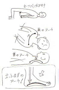 アーチ構造の土台を作る!まず肩立ちのポーズ系の土台つくりとしてセーツバンダアサナが適しています。橋を架けるポーズです。セーツバンダアサナにもいろいろな形がありますがもっとも簡単な、背中の下で手を組みその腕で腰を持ち上げる姿勢(ショルダーブリッジ)を使います。この腰を持ち上げたとき、腰を反る(バックベンド)ことを意識してやることが多いと思いますがそれを肩立ちの土台つくりとして意識してみます。背中の下の肘(ひじ)同士を寄せ、肩・肩甲骨を寄せ絞ります。これで両肩を結ぶ線がアーチ状になります。(イラスト・肩のアーチ)そして肩をお尻の方に寄せる×、のではなく頭の方に少し寄せていきます◎。これで首の後ろがマットに張り付き、ピンと張った糸がプチッと切れるように首の筋を痛めることが防げます。(自動車にハンドルの遊びという余裕があるようなものです。)首の後ろの”遊び”余裕を作ります。同時に首と肩を結ぶ線がアーチの線になります(イラスト・首のアーチ)この両肩の2点を結ぶアーチ首と肩の真中を結ぶアーチの3点(三角)を肩立ちの土台として意識して作ってみます。このアーチ構造が、建築物としての橋などを強くする形であり人体でも、立ったとき体を支える足の土踏まずという体重を支えてくれる形です。アーチ(円弧)の形は、上からの重みを受け止めるバネなのです。それをヨガポーズという姿勢のなかでつくり活用しているのです。以上ショルダースタンド研究1、「アーチ構造の土台を作る」でした。Mind and body RefreshingYOGA NOTEBOOKヨガポーズ研究:ショルダースタンド1「アーチ構造の土台を作る」
