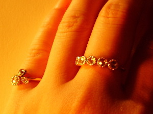 PG、11.5号で作っていただいた ジュエリーエクセレンテさん のリング。5つのモチーフがきっちり指に載って、不足感がありません。これ1本でもすてきです。まだ晴天下ではじっくり眺めていないけど、夜のきらめきには、独特のオーラ感あり。ひさびさの装着画像。まずは、 ベーネ・ベーネさん のローズブーケ・ピンキーと。 高さや腕のボリューム感が、ほぼ共通。アンティーク風だけど、カジュアルに使える組み合わせです。重ねるなら、存在感のあるタイプと合わせるのが、わたしは好みでした。 四角は、グリーントルマリン。シルバーのリングです。オーバルは、ベーネさんの玩具リング。こちらは、正統派な組み合わせ? 曲線の効いたアンティークの極小ダイヤリング、それにヴィンテージ2006。意外と合う気がしたのが、ボリュームのあるタイプ。 縦置きスペサタイトのリングは、アンティーク風のミル打ちあり。レースワークも、インパクトありつつ、決しておかしくない感じ。