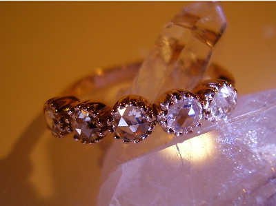 ローズカット・ダイヤを数個ならべたリング。 ベーネ・ベーネさん の定番@共同購入リングは石が小さすぎるので却下。 ジュエリーエクセレンテさん の◆2mm ローズカットダイヤモンド 7石 K18リング \34,800は、悪くなさそうだけれど、半端に高価いような気がする…。といって、◆3.3/2.0/1.3mm ローズカットダイヤモンド グラデーション K18リング \43,050…では、雰囲気がフェミニンに。他方、ずっと見つづけている◆ブラウンダイヤモンド 5石 K18リング \26,040は、ブラウンダイヤが自作ブレスでお腹いっぱいになってしまい。手元には、むしろ透明ダイヤを持ってきたい気持ちになっていました。――と、そこへ出現したのが、新たな特注タイプ。 amira555 さん の3.3mmローズカットダイヤ 5石リング・ヴァージョン。こちらがすっごく!すてきなのですよ。amira さんの記事と画像をじっくり拝見して、自分のなかで「Go!」が出てしまいました。エクセレンテさんに、特注が可能か問い合わせメールをすると、返事がまた、とても迅速でした。ブレーキどころか、さらに加速する勢い。折も折。ちょうどポイント10倍でいいタイミングだったので、きのうオーダーしました。地金は PG。手元のローズブーケ・ピンキー 2個をならべて、5石リングを想像したりしています。そして、いますぐではないけれど、amira さんのお話を伺って、ローズカットダイヤが比較的手頃に入手できるうちに買っておいて、あとで好きな枠に入れるのも手かな、と。枠からはずしにくそうな覆輪でなければ、そういうのもありですよね。たとえば爪留めピアスとか。セミ・オーダーのとき、石の誂えをお願いすると、やや割高かも…と思うので。