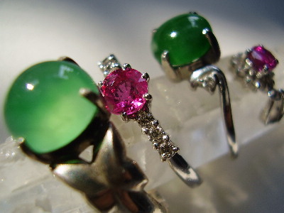 きのうの「勿忘草」で書いた、加工を目論んでいる翡翠が、こちら。左端のシルバーリングです。そのすぐ横が、加工しなおしたいルビー。小さめの正統派グリーンは、 天然翡翠専門 マルコ・ポーロさん のもの。楽天開店まえのころに買いました。色がきれいだけど、透明感とテリが惜しい石です。シルバーのほう。正統派と比べると、色が薄めで青みあり。高さがしっかりあって、光の加減で、色に表情があります。葡萄みたいな水っぽさ。ルビーリングはモゴック産の非加熱。鑑別はないし、それと判るようなインクルージョンも、シロートなので「?」。もし非加熱じゃないとしても、急激なミャンマーインフレや中国好況まえに買えたもの。そう痛手はありません。なにより、光の加減でたのしめるピンク~赤の幅ひろいニュアンス。大好きです。リング加工時の口頭鑑別では「ルビー」。ちょっと微妙な色めです。横のペンダントトップは、 ジュエリーツツミさん の実店舗で遭遇。リングのルビーの色にそっくりでした。たぶん加熱だろうし、加熱ものに手を出したら歯止めが…と思いつつ。そのまま置き去りにできず購入。やっぱり、とても似ているカラーです。