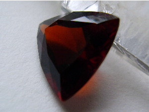 これは、今回の「石探横丁」で買ったルース。地の色はこんなふうに、シナモンというよりはっきり、茶褐色がかったもの。それが光を受けると――真紅に近い赤がメラっ。これは、ヘソナイト・ガーネット。ヘソナイトはふつう、「ハニーインクルージョン」という内包物があって、シロップのもやのような効果があります。このルースでも、ルーペでそれを見ることができるけど。いつものヘソナイトより、なにか強烈なルースです。