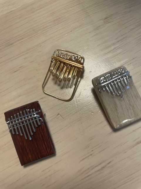 先日、見せてもらったブローチ似たようなもの作れないかな?真夜中に部品を探してみたら これ、いけるんちゃう?鍵盤部分用に長さを調節して半分に折り両側からQ.ピンを通してキリで開けた穴に通し裏側に出して折り込みボンドを塗った表と裏の革をくっつけてフチを紙ヤスリで磨きふのりを塗布して布摩擦で艶出しええ感じに出来上がりましたインテリアにもいいかも?本物のカリンバさんとr次回のレッスンで見せびらかそう(^◇^;)