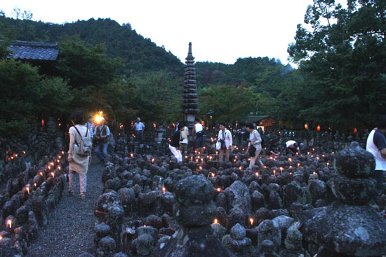 地蔵盆を迎えた今日と明日、嵯峨野の奥、化野(あだしの)の念仏寺で千灯供養が行われています。夕立の合間をぬってお参りしました。 この辺りは平安時代から鎌倉時代にかけて風葬の地になっていて化野(あだし野)と呼ばれていました、死者を供養するために多くの石仏が供えられましたが殆どが地中に埋めれていたようです、明治時代になって一帯に埋没散乱していたものを地域の人達が、この念仏寺に集め供養したのが千灯供養の始まりです。集められた石仏は数千体あり、灯明に照らされると幽玄さに身が引き締まります。夏の夜の観光ポイントとして有名になっていますが、静かに手を合わせお参りされている人も多く居られました。 私もロウソクを求め灯明を供えました、4が私の灯明です。