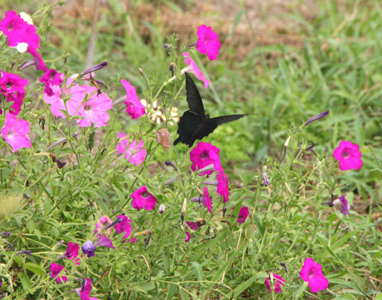 今朝岩倉の菜園で作業をしていたら山あいから大きな黒いアゲハ蝶が蜜を吸いに飛んできました。珍しい来客です。 花の間を飛び回って思う存分吸ったのかまた山の方に飛んで行きました。家に戻って調べてみたら山間部で良くみられる「尾長アゲハ」のようでした、もうシーズン後半なのかよく見ると羽が少し欠けているように見えました。来シーズンはもっと早い時期に若くて完全な姿を狙ってみたいと思います。