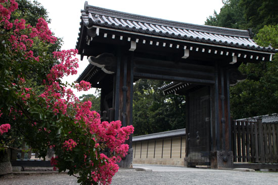 京都御苑には夏を象徴する百日紅の花があちこちで咲き人気になっています。 特に寺町御門の前の百日紅は朱色の鮮やかさと木の豪華さで群を抜いています、前を通る人達は足を止めて盛りを迎えた花を眺めたり写真に撮ったりしています。
