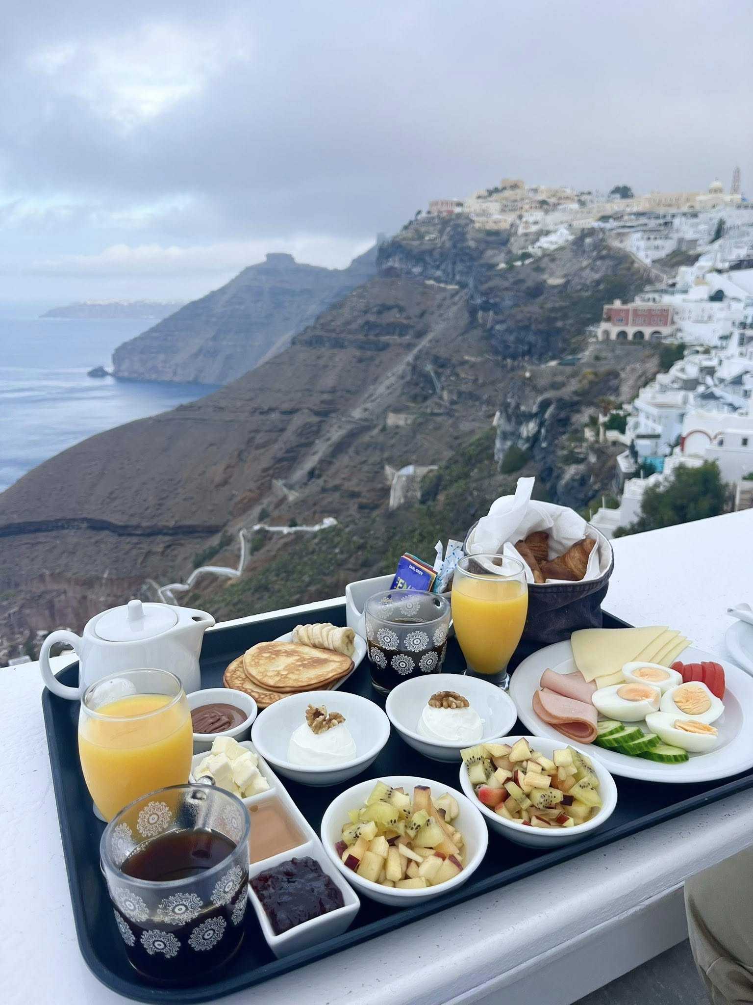 アテネで泊まったホテルは素泊まりだったのでお部屋についてたコーヒーメーカーでコーヒーだけ飲んで地下鉄でアテネ空港に・・・今回はじめて乗る航空会社”エーゲ航空”ですがスターアライアンスメンバーなのでラウンジ利用できます♪青を基調にしたオシャレなラウンジで簡単なギリシャ料理がずらっと並んでいました朝だし、このあと揺れる小型機に乗るので軽めにいただきまーすギリシャヨーグルトとハチミツの組み合わせ、ほんと最高!!実質30分くらいのフライトなので、もうバスみたいな感覚(笑)でもドリンクサービスはありましたアテネの街を見下ろし・・エーゲ海を渡ってあっという間にサントリーニ島!とっても小さい空港です(*´▽`*)空港からバスで、ホテルがある中心街、FIRAエリアに。階段と坂道、そして細い道でGoogleMapがバグりまくって迷子に・・(´;ω;`)重いスーツケースを持ってダンナサマは汗だく!ごめーん!!!でも無事に!「HOTEL THIREAS」とっても可愛い洞窟ホテルです。サントリーニはこのタイプのホテルが人気!お部屋自体は狭いけど、お部屋の目の前にほぼプライベート?なプールとこれまたほぼプライベート?な広々バルコニー!サントリーニ島は11月からオフシーズンなので人も少ないし、ホテルも安くて、でも11月上旬はまだ天気もよくて!大正解でした!