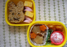 ++ 幼 稚 園 の お 弁 当 No.3 ++- メラニーちゃん弁当 -今日のメニュー五目ご飯(大豆・ひじき・ゴボウ・人参・椎茸)玉子焼き&ソーセージ鶏大根のさっぱり煮小松菜ピーナッツ和えエビカツ(冷食)イチゴヨーグルト今日は、前回のミッフィーに続き、メラニーちゃんをかたどって作ってみました。ご飯は尚&慎の大好きな五目ご飯♪具材を前の晩からチョットに込んで、味をしみ込ませてと頑張ってみましたよ~ん( ̄m ̄*)Vメラニーちゃん顔にするのに具材を下の方に入れたんだけど、チョットひじきが出ちゃったのが残念。でも出来上がりは、炊き込みご飯のいい香りがしてそしてそして大豆の甘みが出て美味しく仕上がりました。鶏大根のさっぱり煮は、ママが大好きなの♪普通の煮物より、チョット酢を効かせて題名のとおりサッパリに仕上げました。コレにからしをつけて食べたらこれまた美味しいんだぁ~そして、尚の感想はというと・・・「ママぁ~今日残しちゃったぁ~チョットみてくれるぅ~?」どれどれ・・・「Σ( ̄□ ̄|||)小松菜&鶏大根煮がそっくりそのまま・・・」お弁当箱の中の状態は、ヨーグルトがこぼれちゃっててこの2品にヨーグルトがついていたの。(≧д≦*)いちお、ヨーグルトにはラップをかけておいたんだけど、かなり激しく動いたみたいね~これは食べる気しなかっただろ~・・・(ママでもヒクよ!)多少残してはきているけど、素直に話してくれたし今回はママの詰め込みミス!ごめんね!きっとご飯とその他のおかずだけじゃ~足りなかっただろ~と思ってオヤツを出そうとしたら・・・・尚はベットに入って眠ってしまいました。早っ!( ̄д ̄;)午後からジャガイモ植えをしたらしいので、疲れたんだね~2005.05.19++ 幼稚園のお弁当☆バックナンバー ++ FCセブン┏┏┏┏┏┏┏┏┏┏┏┏┏┏┏┏┏┏┏┏┏┏┏┏┏┏┏┏┏┏┏┏┏┏┏┏ ++ ママファッション5/16更新!++ *************************************** いつもありがとうございます。(^^ゞ 皆さんのクリックで上位に上げてやってください! ←新着サイトに載ってます。 今日も応援クリックありがとうございました。(^^ゞ****************************************