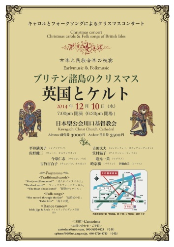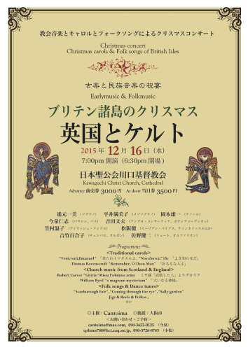<英国とケルト>教会音楽とキャロルとフォークソングによるクリスマスコンサート2015年12月16日(水)7:00pm開演(6:30pm開場)前売券3000円 当日券3500円日本聖公会川口基督教会歌は今回四人です。平井さんの英国モードを中心に・・・進元一美(ソプラノ)平井満美子(メゾソプラノ)岡本雄一(テノール)今泉仁志(バウロン、バス)佐野健二さんや吉田文夫さん、笠村温子さんに加え今年はイーリアンパイパーの松坂健さんも参加されます。◎主催:Cantoima ◎後援:大阪市<お問い合わせ・ご予約>cantoima@mac.com, 090-3652-0125(今泉)cphmn700@hct.zaq.ne.jp, 090-3726-8743(小松)1."Procedenti puerto"13c,~"Veni,veni,Emanuel"13c,~ "Nova!nova!"15c, 2.Robert Carver(Scotland c.1546~c.1586) "Gloria"Missa l'ohmme arme"3.William Byrd(England c.1543~1623) "o magnum mysterium"4.Lute solo5.Thomas Ravenscroft(England c.1588~1653)"Remember, O Thou Man"6.“Carolan’s cottage” & “Carolan’s welcome” Turlugh O’Carolan(Ireland 1670~1738)7.“Lord Galway’s lament”& “Carolan’s quarrel with the landlady “Turlugh O’Carolan(Ireland 1670~1738)8.“Annie Laurie” Lady John Scott(Scotland 1810 - 1900)9.“Scarborough Fair” (English folk song)10.“Water is wide(False love)” (English folk song)11.“Sí Bheag, Sí Mhór” &“Fanny Power” Turlugh O’Carolan(Ireland 1670~1738)12."Coming through the rye"(Scotish folk song)13."Sally garden"(Irish folk song)14.“Christmas eve”(English carol)~“Christmas eve”(Irish reel)15.“Irish Polkas”16.“The wren”(Irish carol)17.“Wexford carol”(Irish carol)18.“Angelus ad virginem””Donny brooks fair”“I saw three ships”賛美歌1.まきびとひつじを2.もろびとこぞりて3.きよしこのよる今年演奏するSally garden