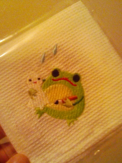 刺繍入りの布巾ですねー。ワッフル地です。照る照る坊主の顔を描いているところでしょうか??