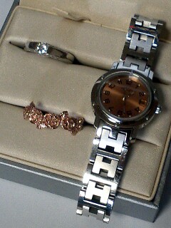 昨年、指輪を2本なくしました。最初の1本目はネットで注文したピンクゴールドメッキの薔薇の指輪。これを炊事をするのにカウンターの上においておいたら無くしました。メッキはいやでしたが、デザインがとても気に入り大好きな指輪でした。家族を巻き込んで探しましたが見つかりませんでした。ネットで当分探しましたがなかなかサイトがみつからず連日遅くまでサイト探しをしていましたが、年末に偶然見つけ、すぐに購入。で、お写真はこちら・・・・・・上段は婚約指輪を結婚20周年目にリホームしたもの時計の文字盤がピンクなので一緒にするとマッチして、とても気に入ってます。お値段?安いですよ~~~ 3,980円 なにせメッキですから・・・・このデザインで本当にピンクゴールド売ってないかな~?これして、温泉につかると多分こわい色になると思います。2本目は年末の掃除で雑巾を洗っていていつのまにか指から無くなってました。母からもらったブルートパーズの18Kのリング。いつも指につけてましたでもなぜか、無くしたのにもかかわらず、絶対に探す~~~という気持ちになれませんでしたあのメッキの指輪は探さないと~~~と思ったのに・一応家族巻き込んで探しましたがどうしても見つからずじまい指輪が悪いことをもって行ってくれたのだと思うことにしました。これは、編み物教えている生徒さんから頂いたものです。生徒さんが編んだケープの糸があまったので、私がコサージュを作りました。そのお礼に・・ということらしいです。こんな素敵なものいただけるならコサージュいくらでも作りたい気分です。逆に教えてもらいたいぐらい。なんだか得した気分