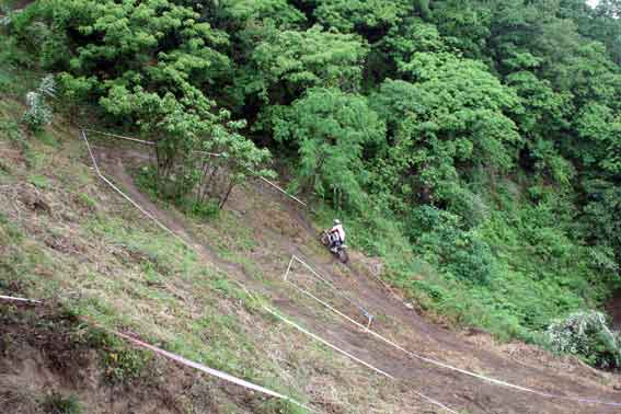 四国選手権第4戦愛媛大会の会場の「明和トライアル場」は、徳島県境に近いミカン山の山頂付近にあります♪斜面にあるトライアル場なので・・・当然、斜面だらけです・・・(笑)!!写真は久しぶりにセクションとして使われた斜面です♪今回の第1セクションとなりました!!ひとつ目の斜面をターンして・・・次の急斜面の「ヒルクライム」にトライします!!こんな斜面が・・・待ち受けています・・・(@_@;)!!きれいなフォームで加速するのは、愛媛の国内A級山本丈司選手です♪「すえドンのフォト日記」http://sueyasumas.exblog.jpに写真をアップしています\(^o^)/(●^o^●)♪