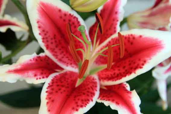 ユリ系の花だと思うのですが・・・綺麗な花が我が家に咲いています(●^o^●)♪とっても鮮やかです♪(*^。^*)♪