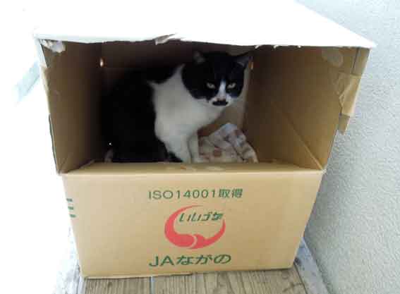 おはようございます♪久しぶりに・・・ゆっくりとした日曜日の朝となりました♪先週は鳴門市内のビジネスホテル、先々週は下関市のユースホステル、その前が「山川こうつウォーク」で、その前が「四国選手権最終戦」、さらにその前は「秋祭り」でした・・・(@_@;)!!今日は・・・やはりイベントがあります・・・(笑)♪午前中の早い時間に買い物を済ませ、JR阿波山川駅前を午前11時頃に出発する無料シャトルバスに乗って、吉野川市美郷で開催中の「美郷梅酒まつり」へ向かう予定なんです!!(●^o^●)♪今朝のニャンコはノラです♪勝手口の前に作ってもらった「ダンボールハウス」が2個・・・♪手前の大きい方は・・・実はチョビの家なのですが・・・ノラは向こう側の少し小さい方なんです・・・。でも・・・やっぱり大きな家の方が・・・いいのでしょうか・・・(笑)♪空いているか・・・確かめていました(笑)!!(●^o^●)♪