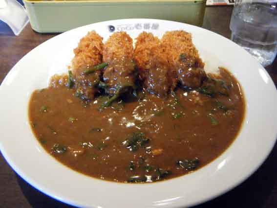 最近、この「カキフライほうれん草カレー」がお気に入りです(●^o^●)♪「カレー」と「カキフライ」、相性が抜群でと思います(*^。^*)♪でも・・・私・・・「生カキ」が食べられないのです・・・(>_<)!!美味しそうに食べているのを見て、食べようとするのですが・・・のどを通りません!!「焼きカキ」や「カキ鍋」は大丈夫です(笑)♪「カキフライ」は大好きです(*^^)vでも・・・「生カキ」だけは・・・(T_T)・・・。今日の昼食はCoCo壱番屋の「カキフライほうれん草カレー」です♪最近は「3辛」に定着しました!!「カレー」を食べると・・・元気が出ます(●^o^●)♪