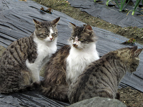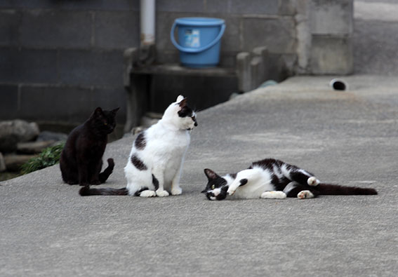 おはようございます♪昨日からの雨はあがっています!!しかし、よく降りました・・・。かなりの降水量になっていると思います♪今朝のニャンコは、仲良し三匹・・・ハナ・シロ・チビクロです♪ ゴロゴロしているハナちゃんと、シロちゃんはふじこさんの子どもです♪チビクロは・・・どこかからやって来たニャンコです♪三匹はいつも一緒に寝ています\(^o^)/ のどかな光景です・・・(笑)♪夕方になると、庭のいたるところでニャンコ達がゴロゴロしています♪(●^o^●)♪