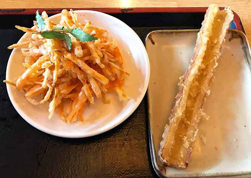 「釜揚げうどん」(小)と、私の定番「ちくわ天」、そして「にんじんのかき揚げ」です♪
