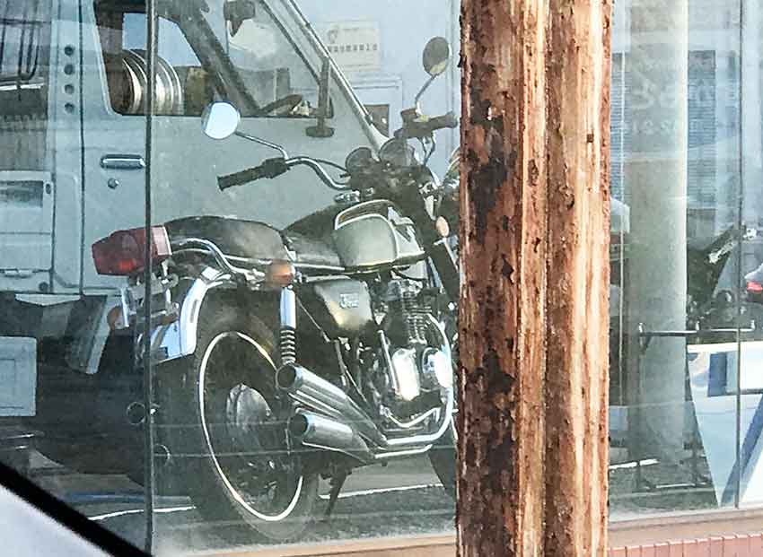 ショーウィンドウに、懐かしいホンダCB350が飾られています!!