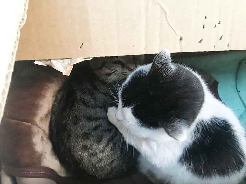 ダンボールハウスの中、だい吉とトラちゃんが仲良く寝ています!!