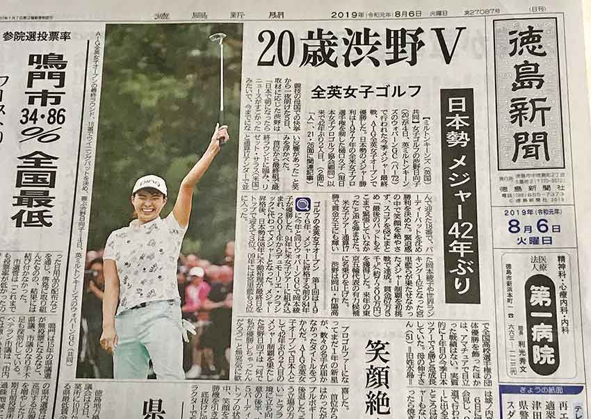 今朝の徳島新聞一面、全英女子ゴルフです♪