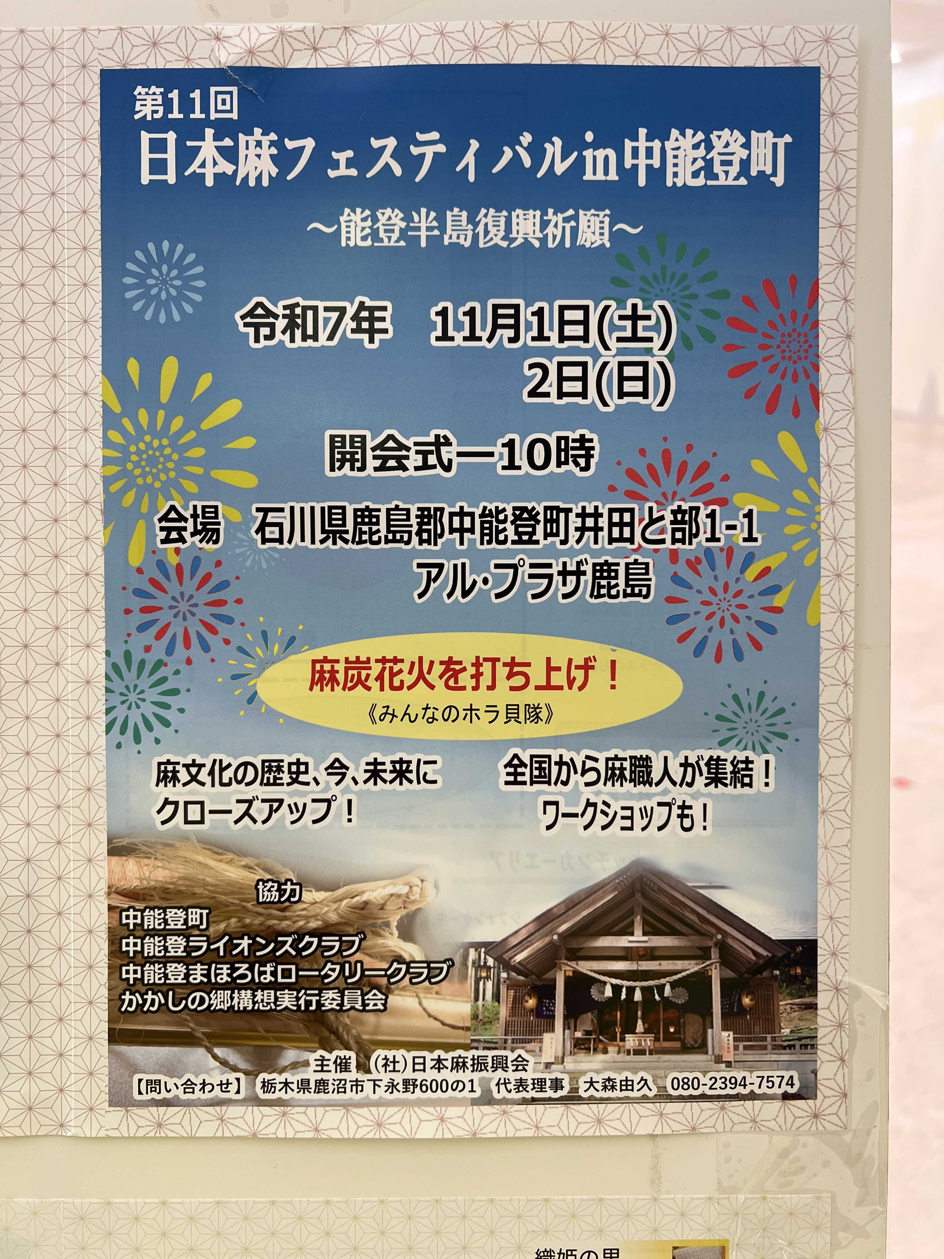 令和7年11月1日(土)・2日(日)の二日間、石川県鹿島郡中能登町の「アル・プラザ鹿島」で、第11回「日本麻フェスティバルin中能登町」が開催されました。〜能登半島復興祈願〜の願いを込めて‼︎私は「阿波忌部麁服保存会」の一員として、今回も参加させていただきました。一昨年の第10回大会は、徳島県吉野川市山川町で開催されました。去年、北陸地方で開催する予定でしたが、能登半島の震災で延期となりました。「令和の大嘗祭麁服供納」として、参加しています。さすがに「織り機」などは運べないので、バナーを作成して展示しました。今、帰りの高速バスの中です。午後8時過ぎに松茂バスステーションに到着し、1時間ほどかけて吉野川市山川町の集合場所に移動します。そこから車で10分とかかりません。