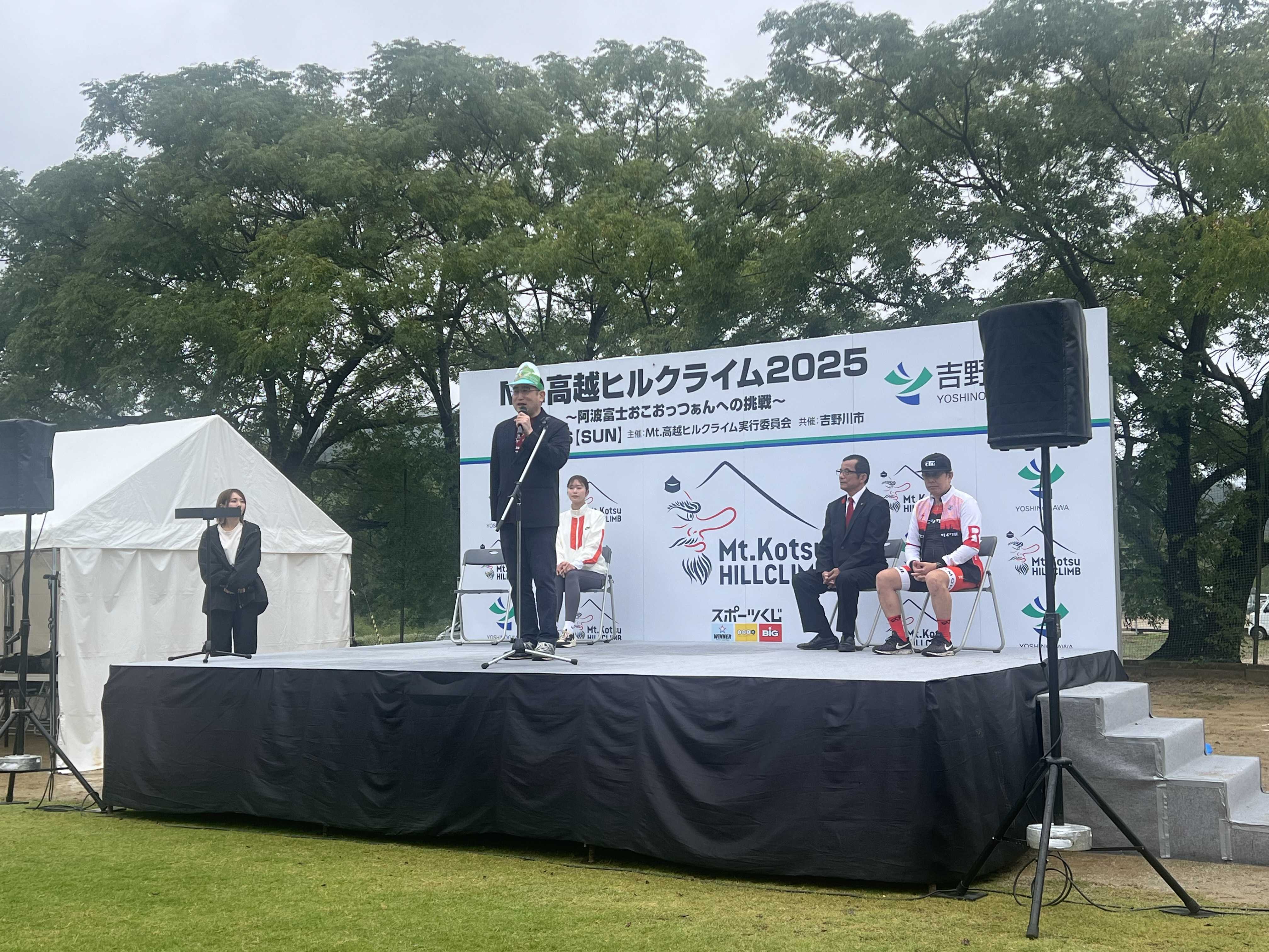 雨はあがりました。初めてのこころみ、M t.高越ヒルクライム2025が開催されました。会場までは自宅から10分。午前9時半前に入りました。開会式が始まりました。スタートは少し先の高越大橋。ここから高越山の「船窪つつじ公園」まで、坂道をひたすら自転車で登ります。アンバサダーの方。12日後、商工会議所婦人部から講演を依頼されています。パワーポイント作成に励みました‼︎