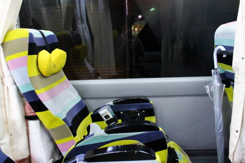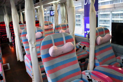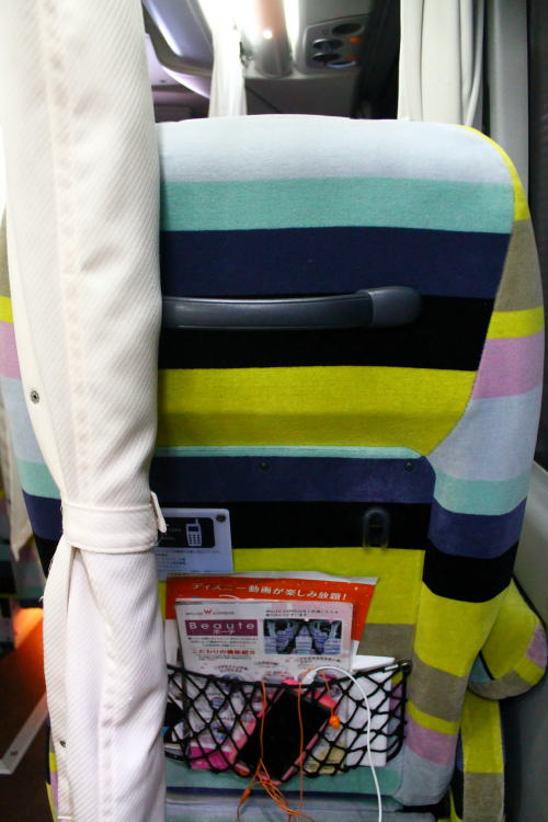 なんだか煩わしく見えますが、女性のためのバスということもあって個室感覚で利用できるようにMYカーテンがバッチリ。お休みでなければ、開けておきましょう(始発地点出発時に運転手さんからSA出発時に人数確認をなさるときにご協力をお願いしたい、とのアナウンスがありました)。