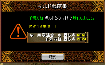 本日は、花粉症はましです。くしゃみも目のかゆみもございません。ただ、寒いだけでございます。今日は、木曜のGvの結果から。こちらの相手さんとは、ホイホイのときに完敗でした。完敗というか、勝負にならないぐらいのLv差がありました。無双でも、とてもLv差がありましたが、一致団結!!無双のいい所が出て勝つことができました。1BISだったんですけど、うまいぐあいにコルを使って、支援のかけ直しなどできたので、満点の内容じゃないかな~と。個人的には、昨日は、いい動きできたと思っています。まさに自画自賛!!最近は、納得いかない自分でしたが、昨日は、楽しくできました。この調子を持続して、さらにPスキルを磨きたいですね~。無双としては、深刻な問題が。。。BISさんが~って感じです。この前までは、BISさんがたくさん来られてましたが、最近は、ずっと一人か二人の参加です。いつも、会場に移動するときドキドキしています。どんどん参加してほしいと心から思っております。今日は、最後に燃える闘魂による、闘魂注入SSでオサラバ!!