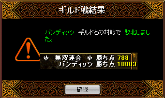 最近、日記をさぼり気味になってきました。RSにINして終わる頃には、とても眠くてすぐ寝てしまいます。毎日じゃなくてもちょっとづつ書いていきたいな~と思います。さて、昨日は、短パンと、ホイホイの両方のGvがありました。これは、短パンの結果。場所は、一番好きなCross Counter?やったかなwあそこ広くて好きですね~。好きな理由はそれだけですけどw完勝でしたね~。でも、死者をだしてしまったことに反省しています。続いては、ホイホイの結果。・・・・・SS摂り忘れました。撮る癖ついてきたんですけど、完璧ではございません。結果は、完封負け。こっちは、5人で、WIZなしだったんで、狭いところで待ち伏せ作戦。しかし、相手さんも一緒のような作戦っぽかったので、特攻しようということに。相手WIZさんをもう少しで倒せかけたんですけど。。。これからは、隠し子でしかGvでません。WIZいないwGv勝負にならないw相手さんにも迷惑かかってしまいますからね~。今日からは、少し隠し子のLv上げに励みたいと思っています。ではこの辺で~ノシ