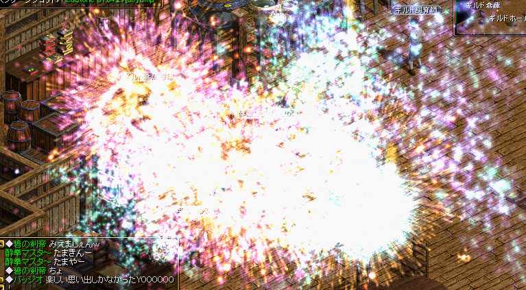 私、本日引退しました~。何かと色々あった1年ちょいでした。自分で思ったことは、よくも飽きずに続けたな~と。これも、お世話になったギルメン、友達のおかげでございます。今までありがと~。そしてファイト!!&サヨウナラ~。愚連隊ギルメン、ホイホイギルメン、無双ギルメン、短パンギルメン。花火いっぱいあげてくれました~。みなさん、今までありがトゥー!!そしてまた会う日までサヨウナラ~。バイバイキ~ン。